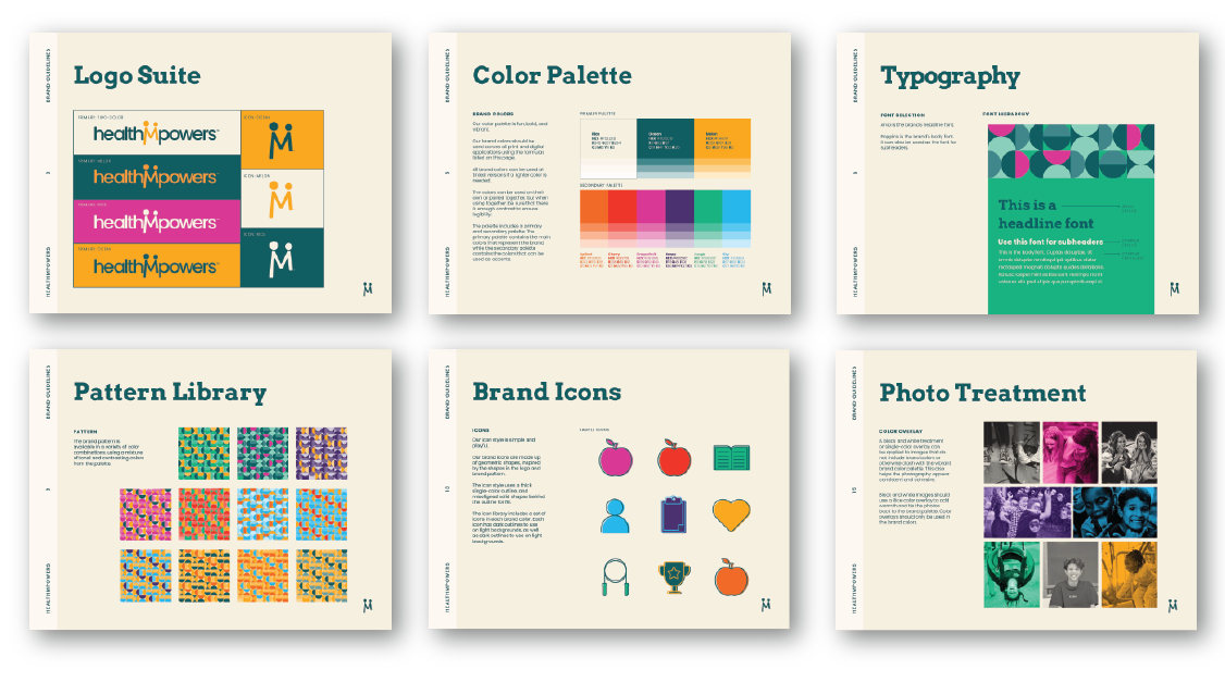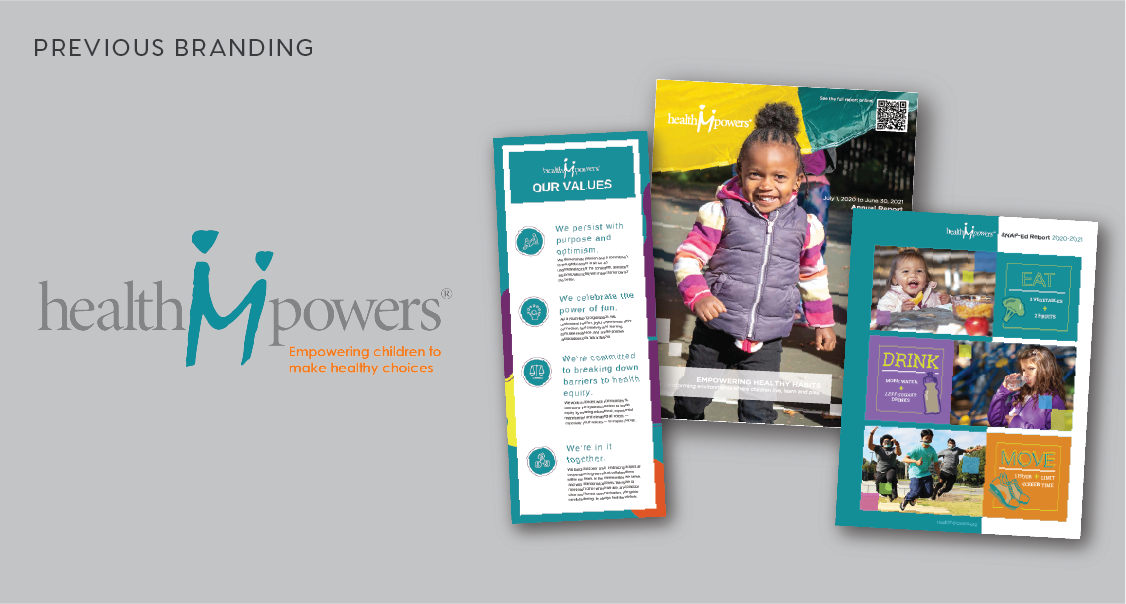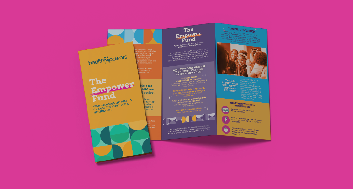 HealthMPowers is a Georgia-based non-profit that helps kids – and the communities who care for them – make the changes that lead to better health, for life. They came to us looking to update their brand identity to something more fun and bold. We created a full logo suite, a vibrant new color palette, a geometric brand pattern, and custom icons, then put it all together in updated branded collateral.