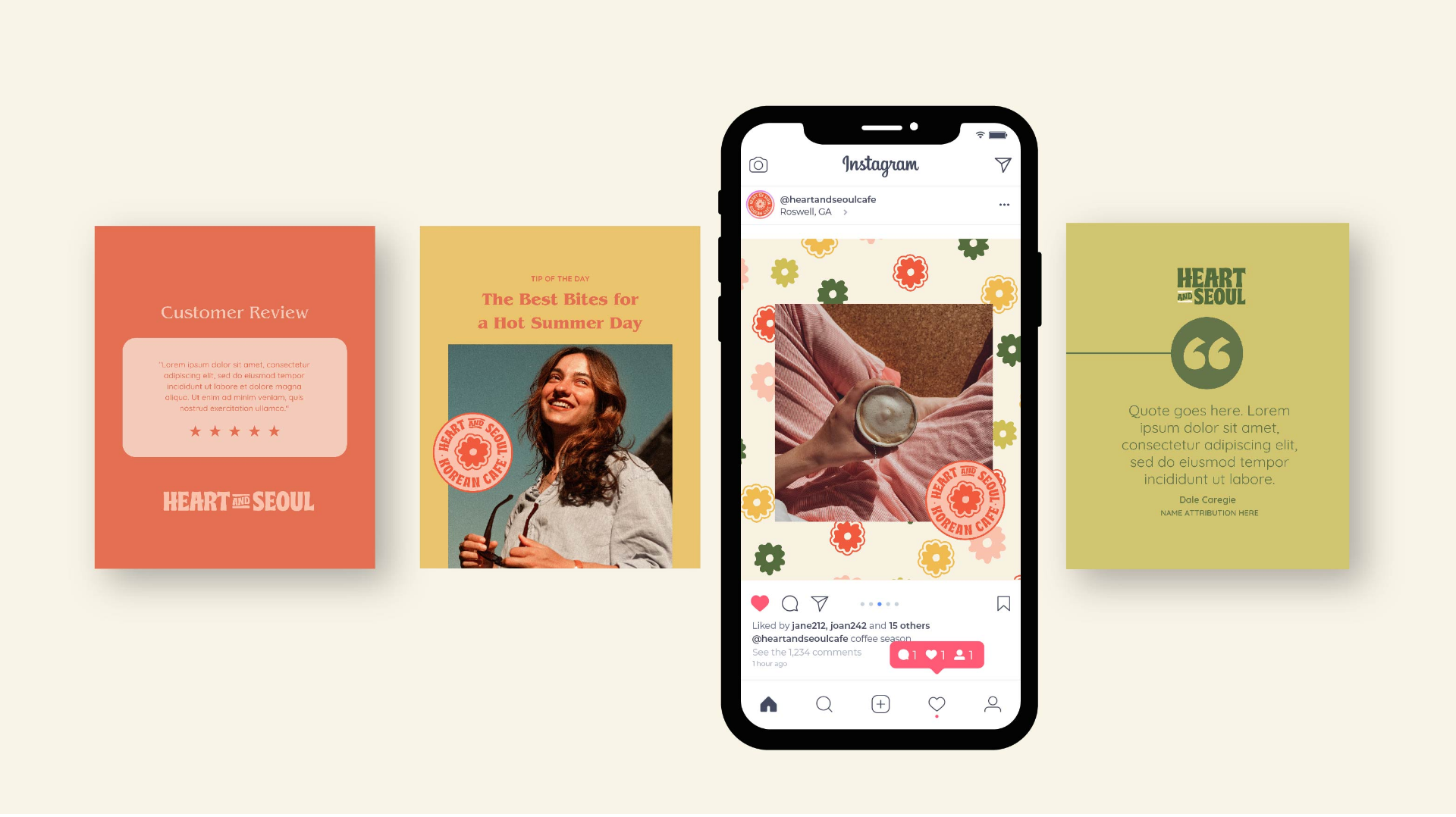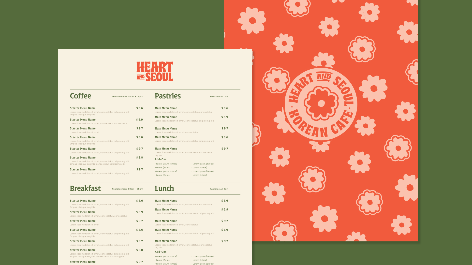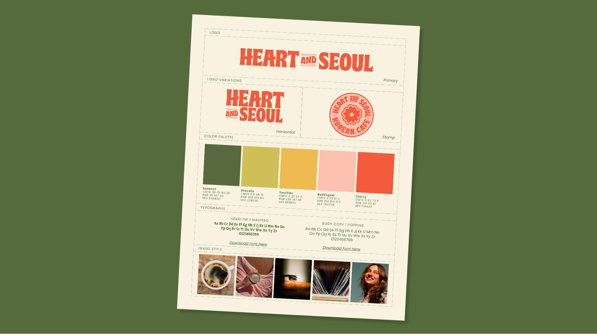 We developed the branding for Heart and Seoul in just *one day* as part of our Branding Intensive service. During our prep period, we worked with Julie to understand her inspiration for the café and its menu so that we could hit the ground running on Design Day and develop a brand that truly reflected her vision. From this, we agreed that we wanted the brand visuals to feel slightly retro, welcoming, and to subtly nod to the Korean influence.