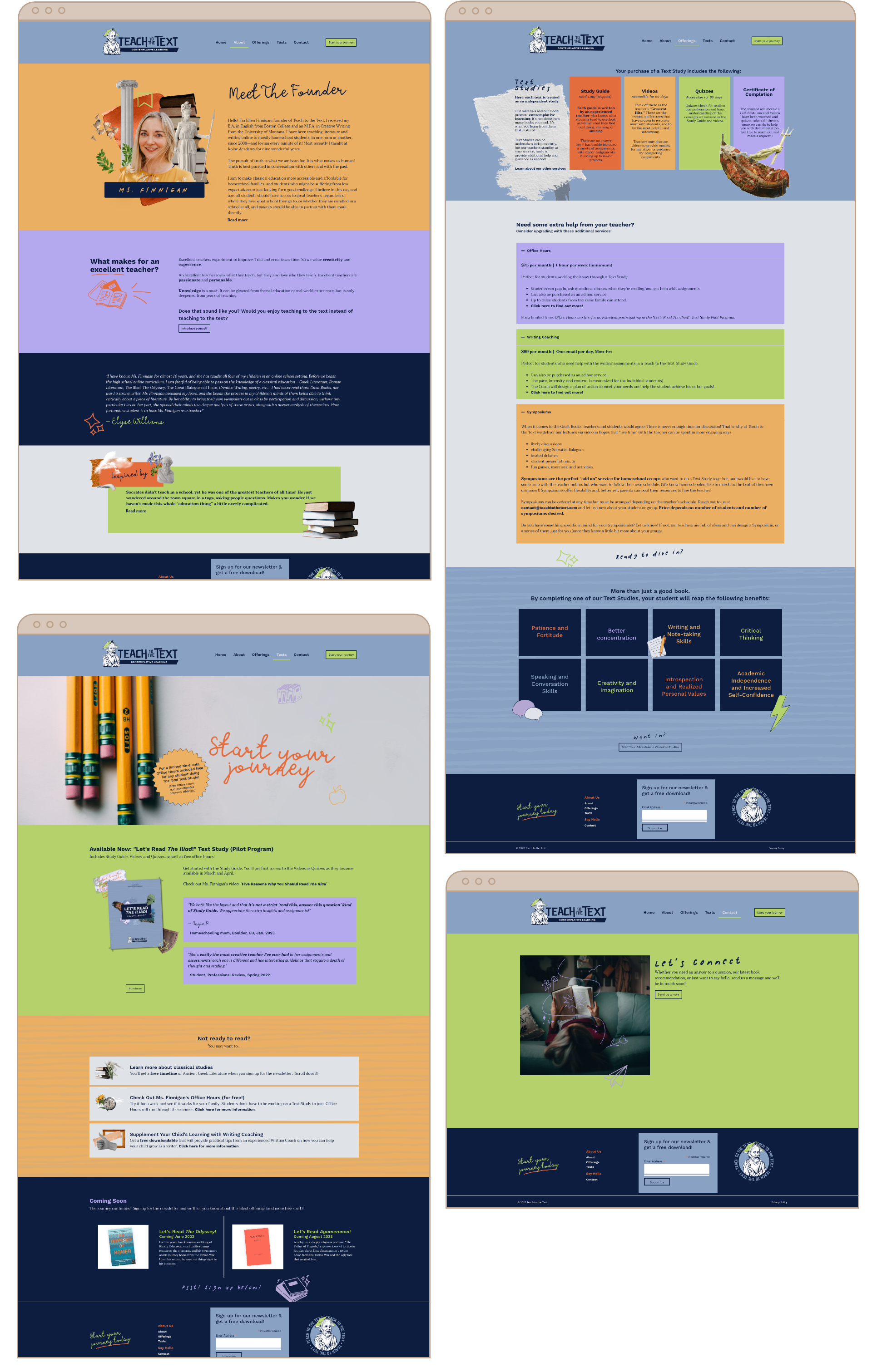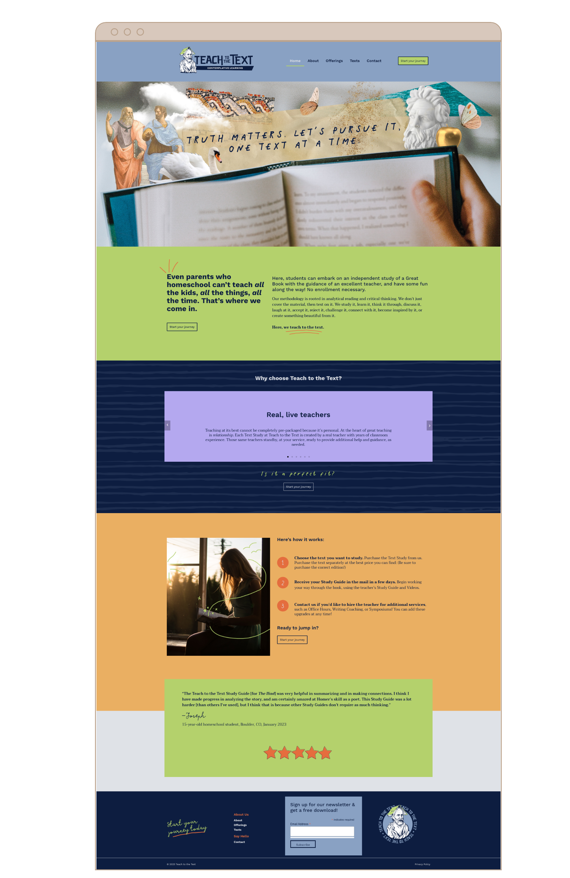 Teach to the Text provides study guides for homeschooled students with the goal of inspiring discovery of, critical thinking about, and above all, a deep love of classical literature. The program needed a fun and playful brand to align with the fresh take on the world’s oldest texts. We refreshed Teach to the Text’s existing branding, updating the logo with bolder typography, refreshing the color palette, and introducing collage and squiggle elements. We developed a website and class materials (including the study guide) implementing this new branding.