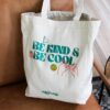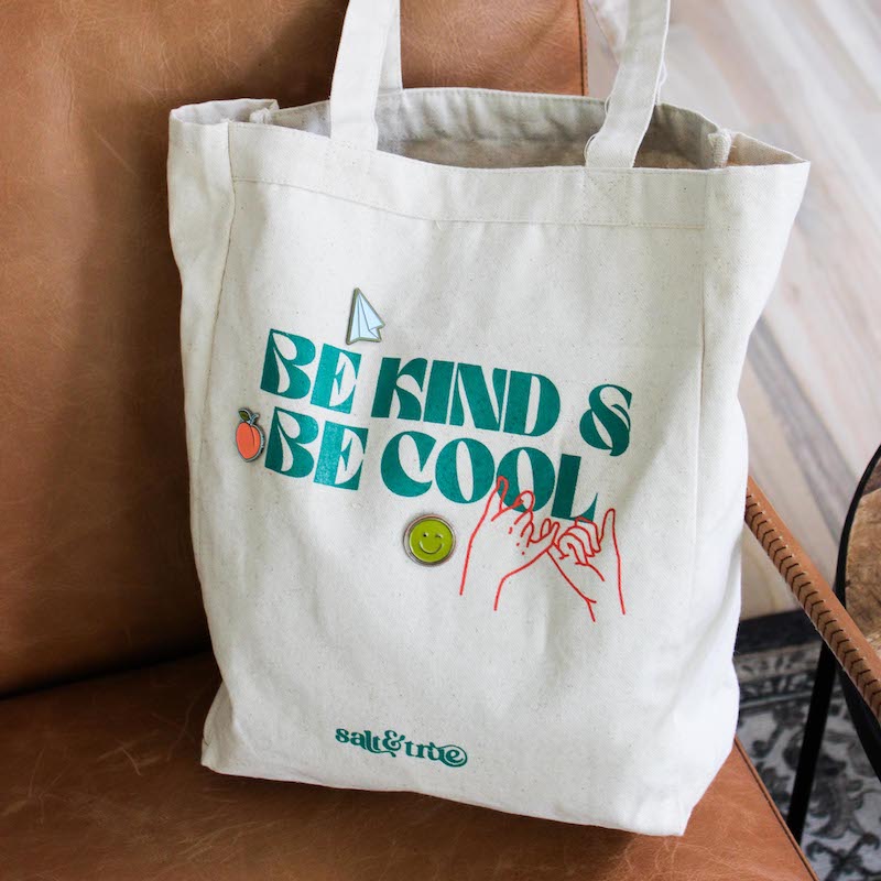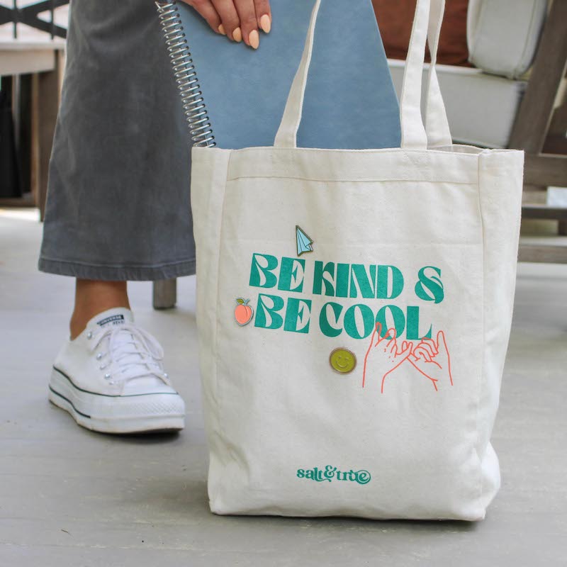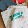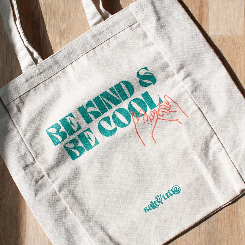 This is a durable, natural cotton tote screen-printed with a fun design. It’s 14 inches tall, 10.5 inches wide, and 5 inches deep.