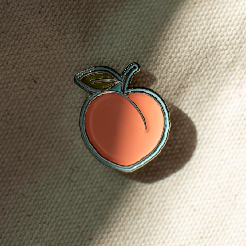 This cute little peach pin is ripe for the picking! Stick it on your favorite sweatshirt, backpack, or grocery tote.