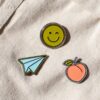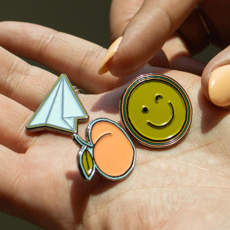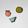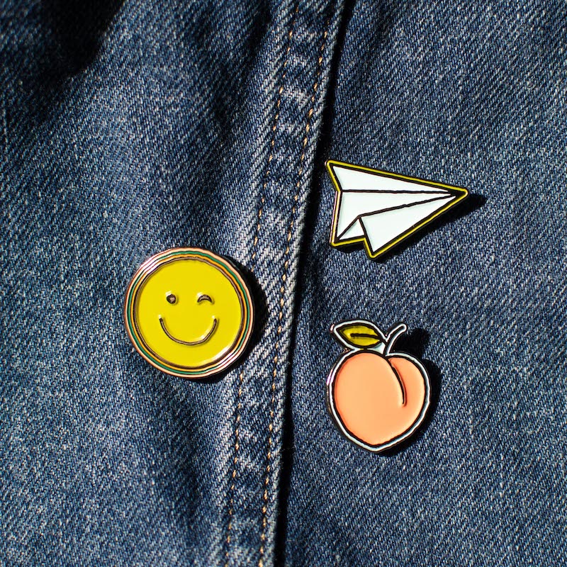 Grab all three of our enamel pins with our Party of Three pack. This cute set includes our Flying High paper plane, the sweet Just Peachy peach, and the always-fun (and sometimes mischievous) Smile and Wink pin.